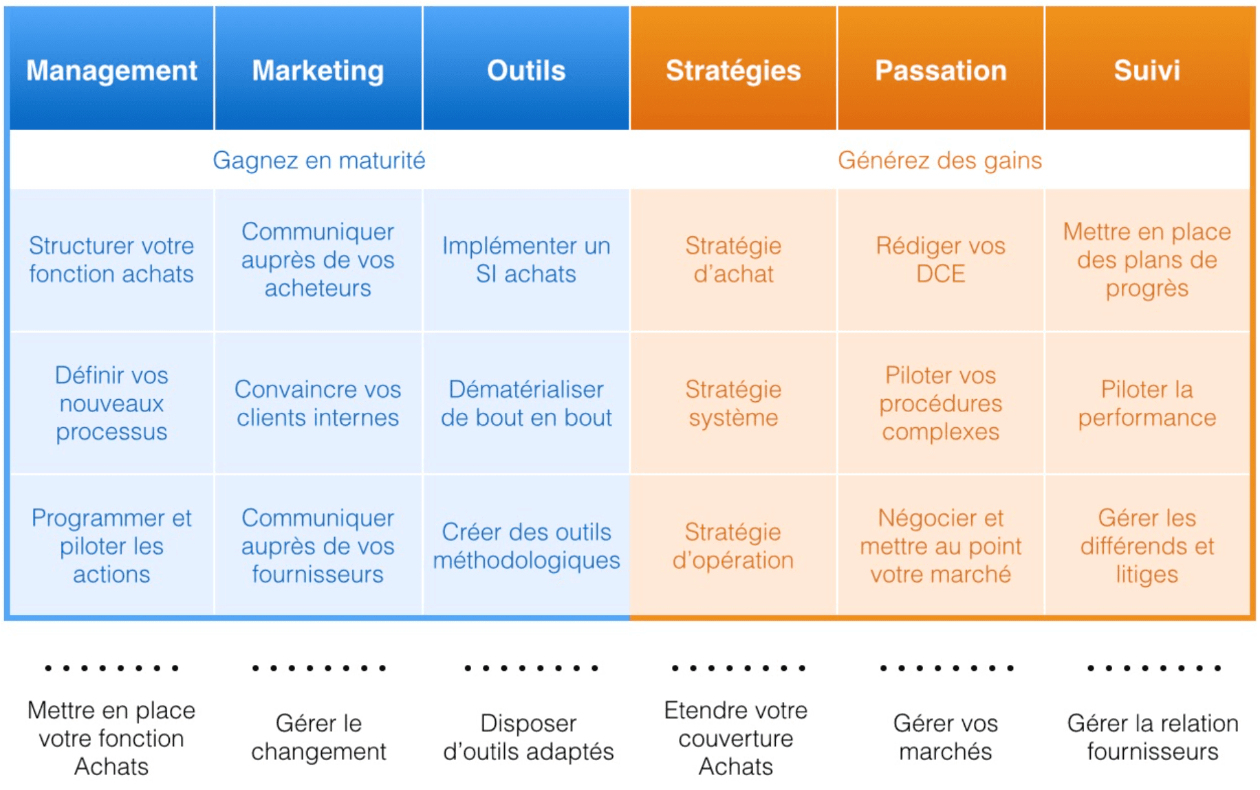 Mettez en place votre fonction Achat ou Marchés ; modernisez vos processus ; générez des gains ; sécurisez vos procédures et améliorez la performance de vos contrats, externalisez vos marchés
