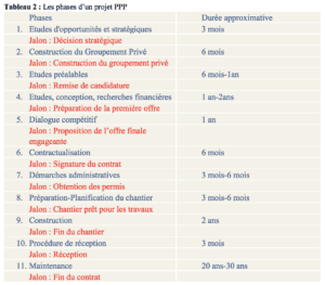 Cliquez pour afficher les commentaires associés DAJ 2016 – Les marchés de partenariat Lorsque le marché de partenariat est passé par une personne morale de droit public, il s’agit d’un contrat administratif par détermination de la loi . Il est soumis aux mêmes dispositions générales que les marchés publics classiques à l’exclusion de certaines règles. Ne s’appliquent ainsi pas aux marchés de partenariat les dispositions relatives à l’allotissement, à la durée du contrat, aux prix, à l’exécution financière du contrat et à la sous-traitance . Le marché de partenariat n’a de sens que sur une certaine durée, déterminée en fonction de la durée d’amortissement des investissements ou des modalités de financement retenues. En effet, il ne peut y avoir de justification économique à recourir à un marché de partenariat que sur la durée : Exemple de délais de passation – Source : ESRA TEPELI, Thèse 2014 Bordeaux – PROCESSUS FORMALISE ET SYSTEMIQUE DE MANAGEMENT DES RISQUES POUR DES PROJETS DE CONSTRUCTION COMPLEXES ET STRATEGIQUES PROCESSUS FORMALISE ET SYSTEMIQUE DE MANAGEMENT DES RISQUES ![]()